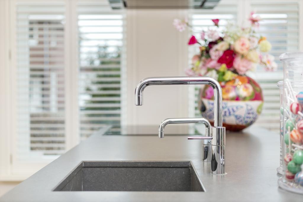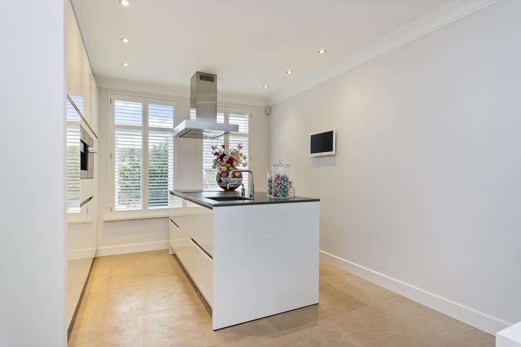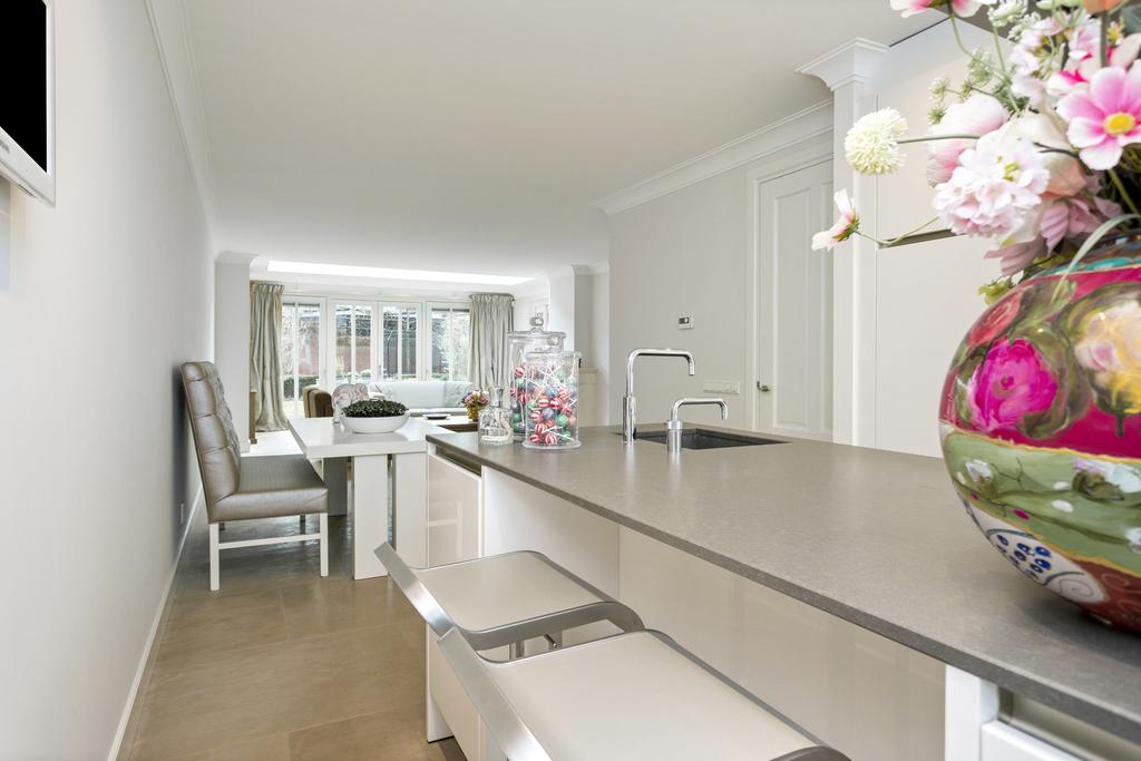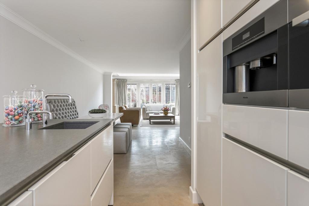 De keuken beschikt over een hoogglans interieur van het merk Siematic. Een en ander bestaat uit een spoel-/kookeiland met hardstenen werkblad, bargedeelte, diverse kastruimte en (inbouw)apparatuur zoals een keramische kookplaat waarboven een afzuigkap en een vaatwasser. Parallel aan het eiland is een kastenwand aanwezig. Hierin treft u aan een koffiezetapparaat. combimagnetron, koelkast en voldoende bergruimte. Alle inbouwapparatuur in de keuken is zeer luxe te noemen en is van het merk Miele. De enige uitzondering is de afzuigkap. Deze is van het merk Siemens.