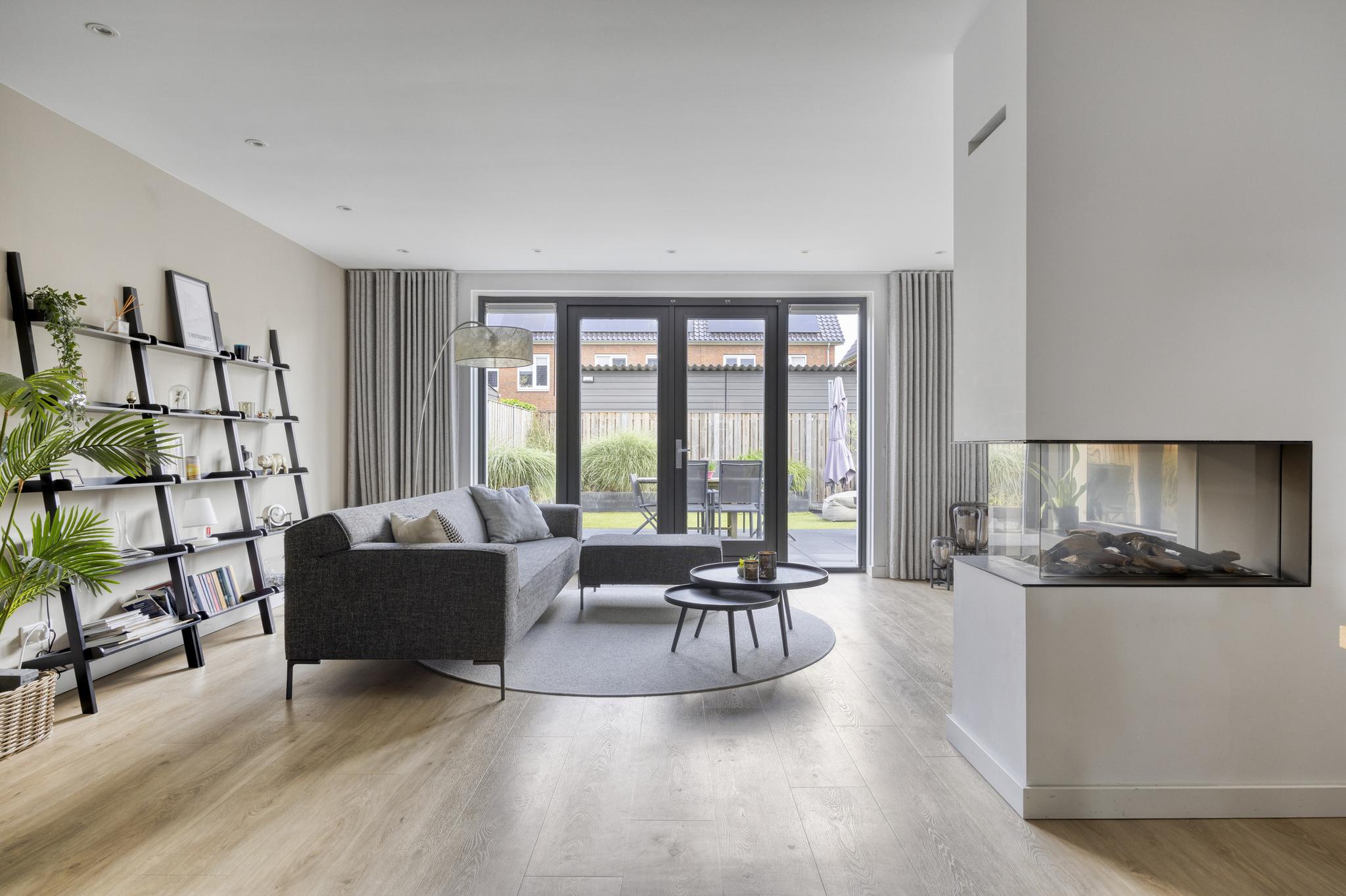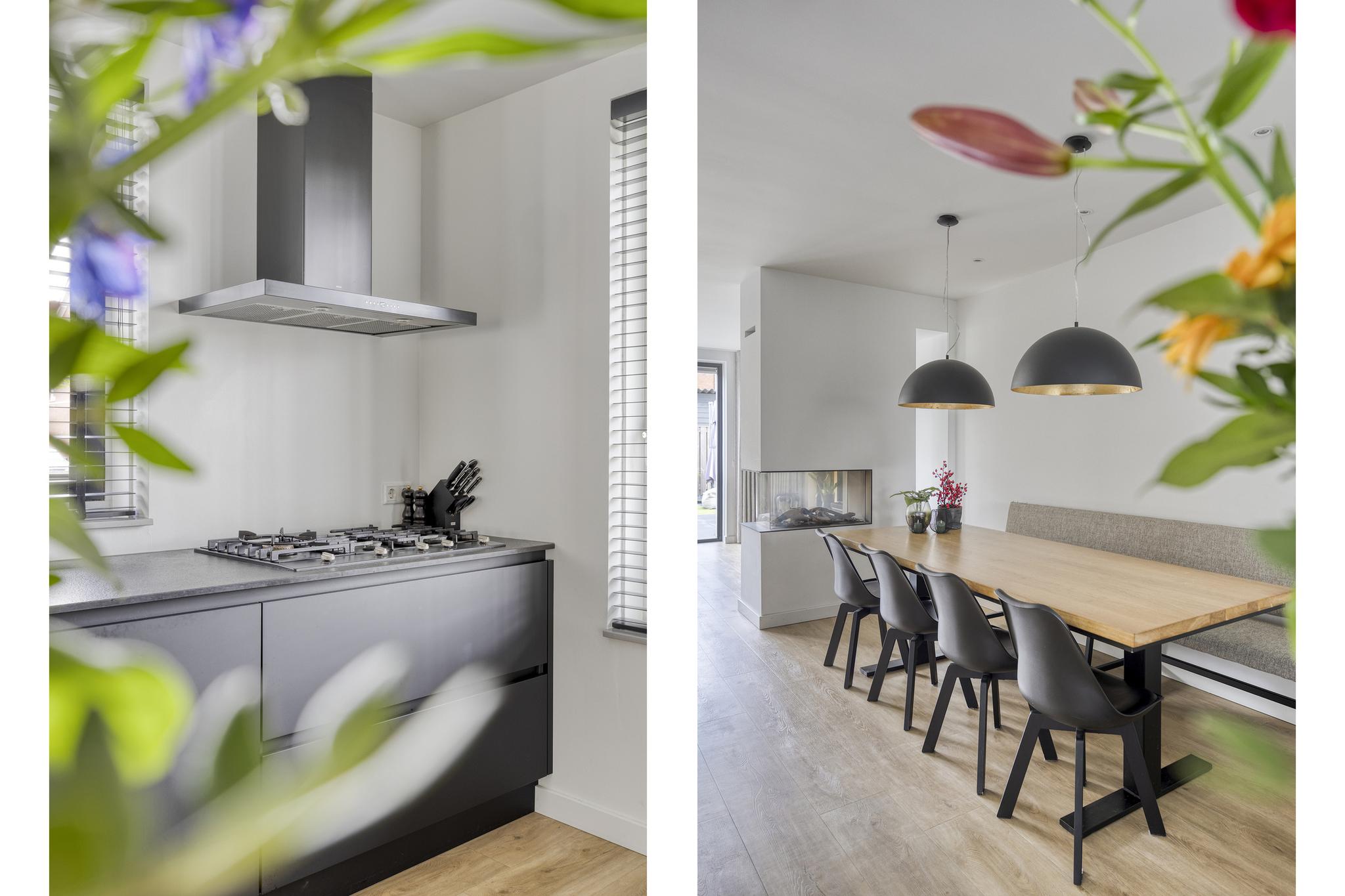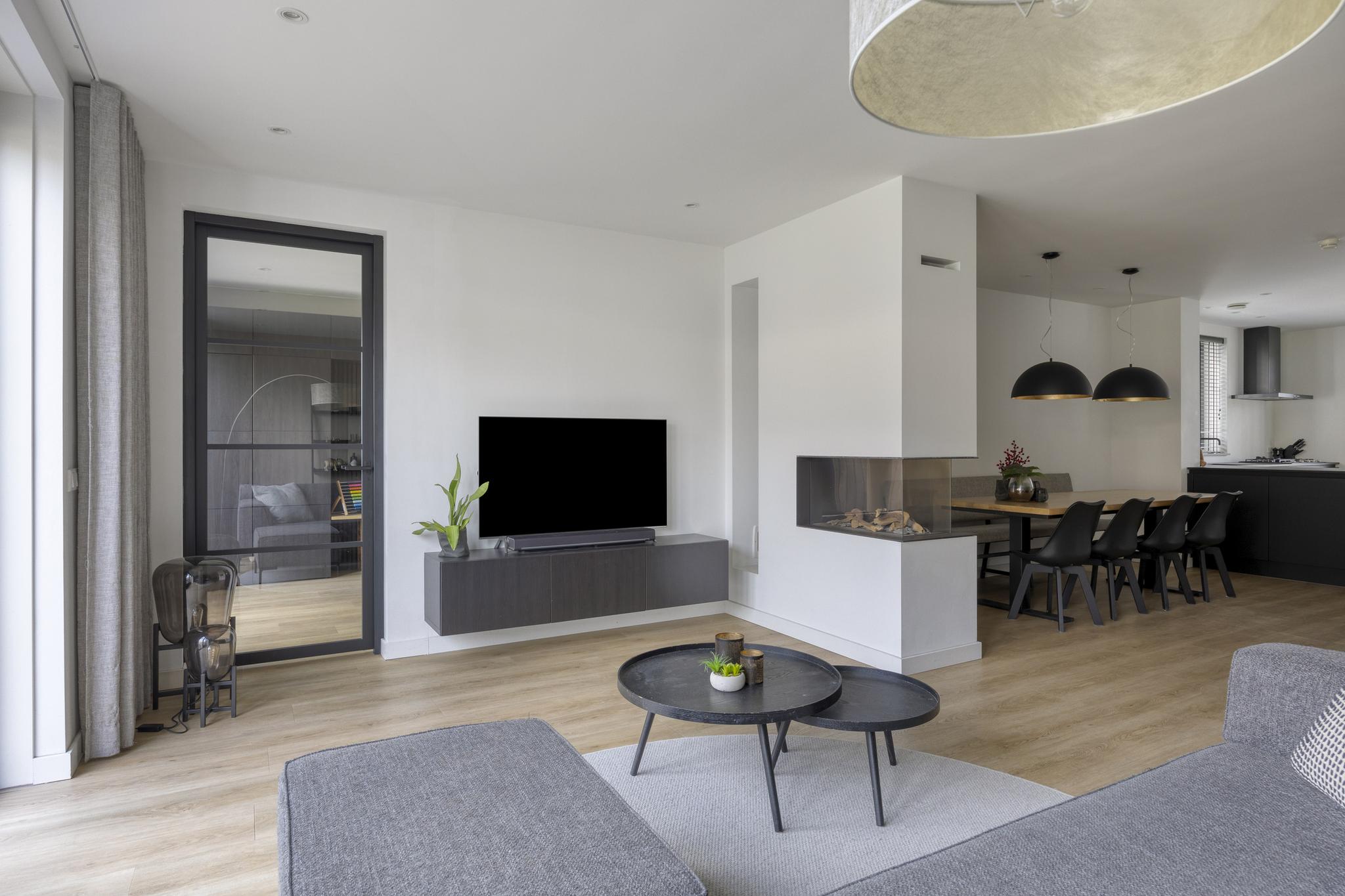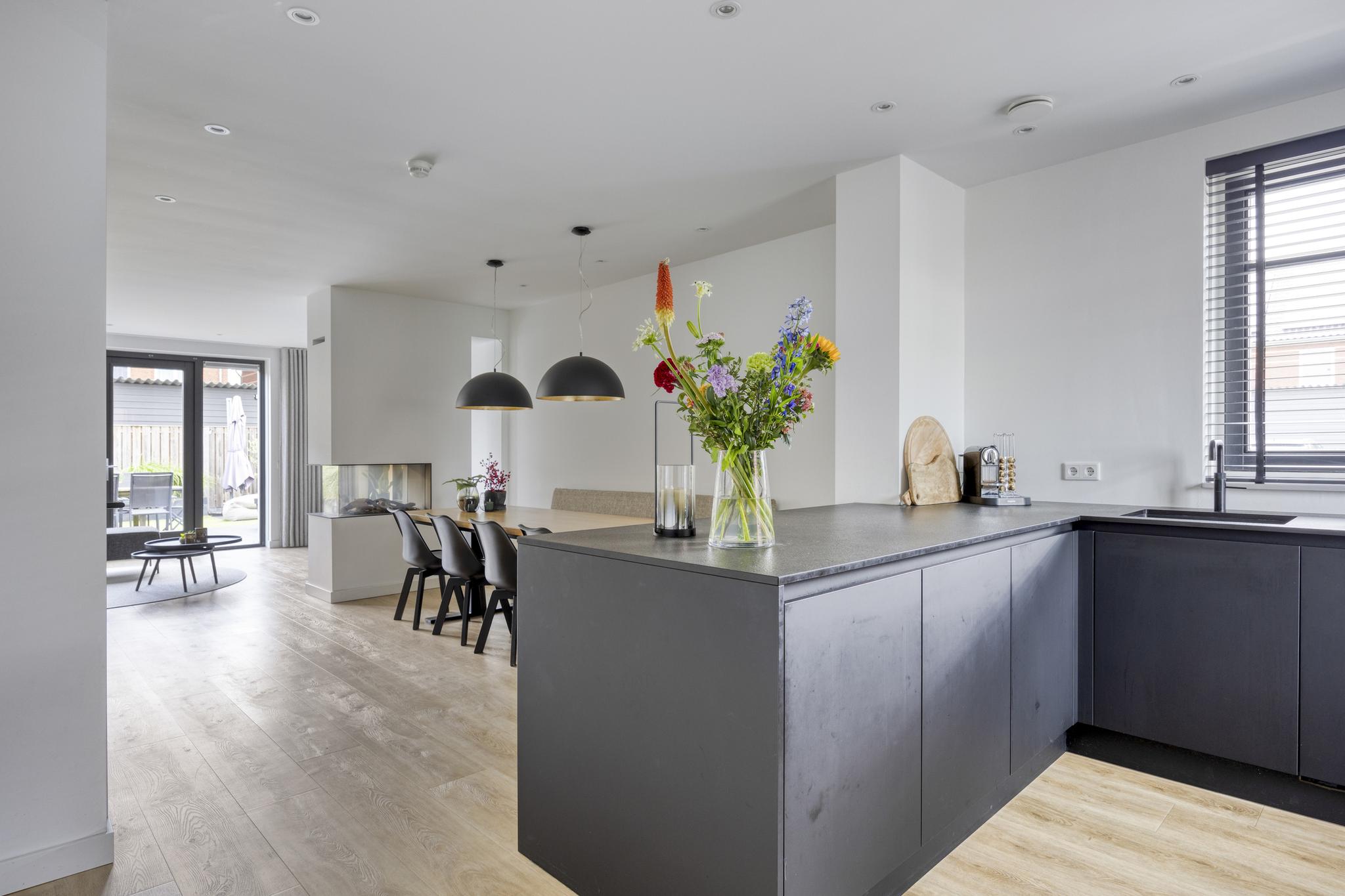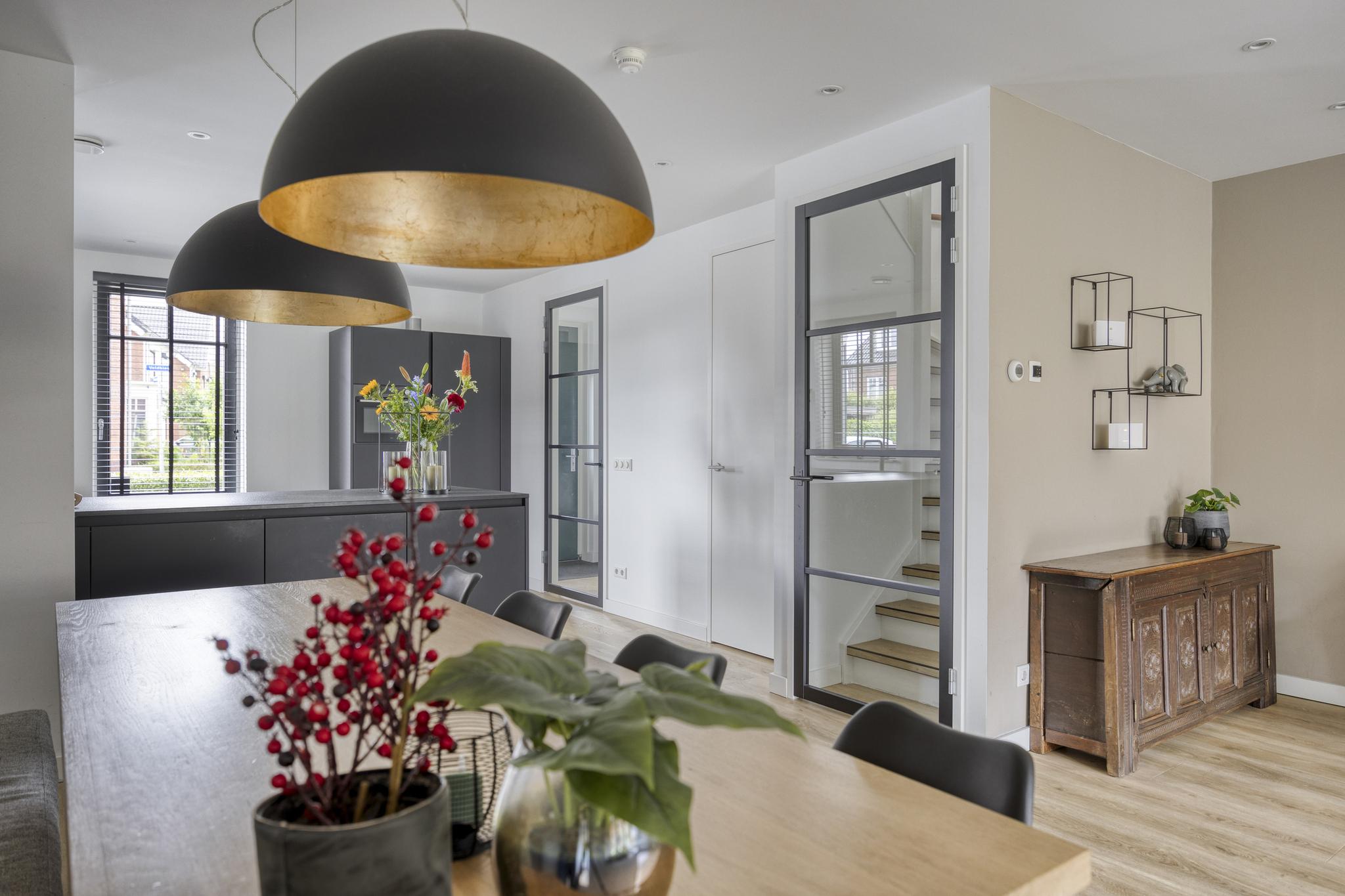 Parkeer je auto op de ruime oprit en betreed de woning via de voordeur. Je komt binnen in de entreehal met toegang tot de meterkast, het toilet en de keuken. Opvallend zijn de luxe houten binnendeuren, die deze verdieping een stijlvolle uitstraling geven. Aan de voorzijde van de woning bevindt zich de moderne open keuken, uitgerust met onder meer een nieuwe vaatwasser uit 2024, een combi-oven, koelkast, vriezer, Quooker en een gaskookplaat. De keuken loopt door de eetkamer vloeiend over in de woonkamer aan de achterzijde van het huis. Hier is voldoende ruimte voor een gezellige zithoek en een ruime eettafel. De gashaard functioneert als roomdivider en zorgt voor extra sfeer, zeker in de wintermaanden. Dankzij de dubbele tuindeuren heb je direct toegang tot de zonnige achtertuin. De woonkamer beschikt ook over een handige trapkast, toegang naar de trap naar de eerste verdieping en naar de multifunctionele ruimte welke weer toegang geeft naar de inpandig te bereiken garage.