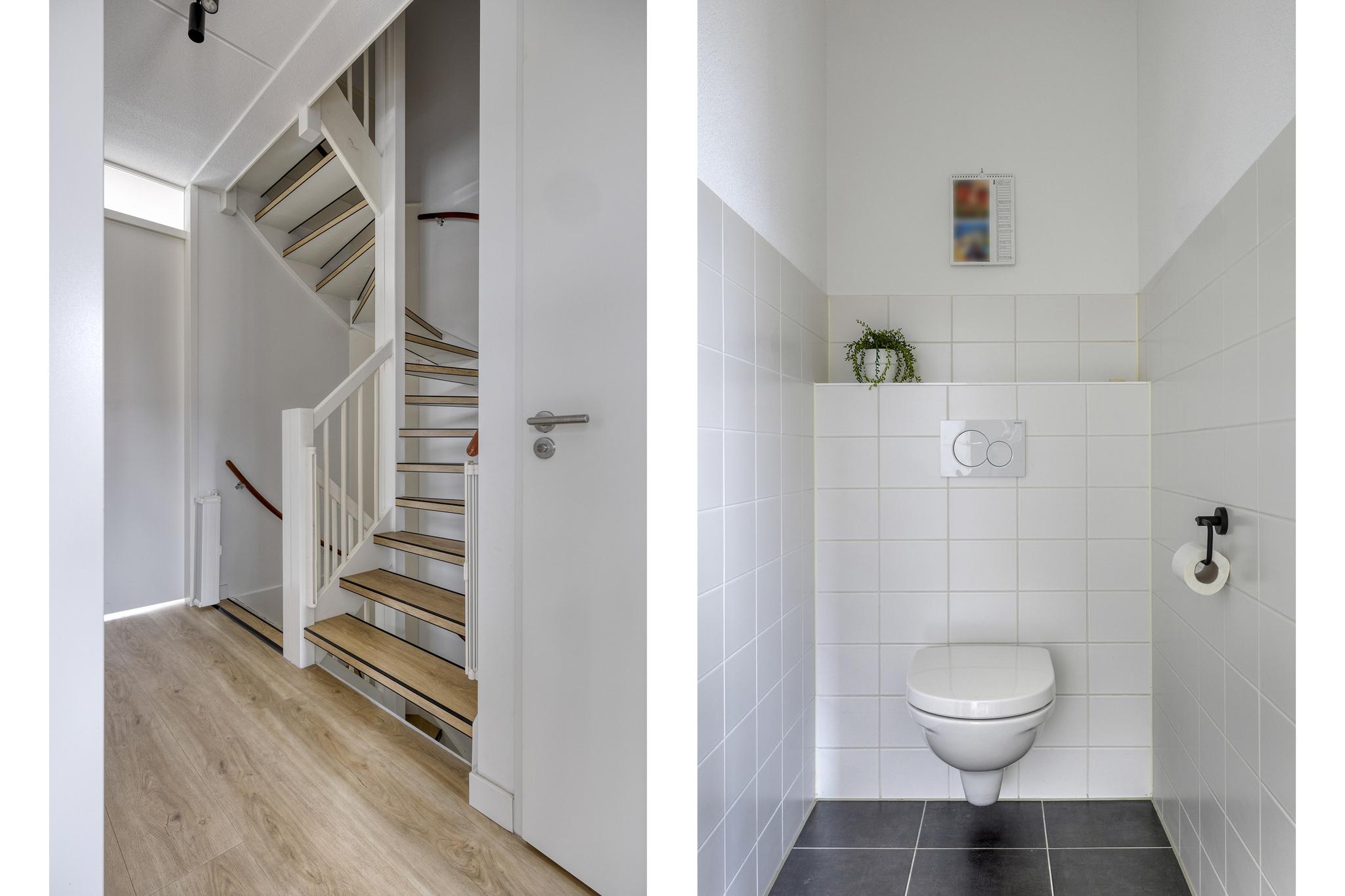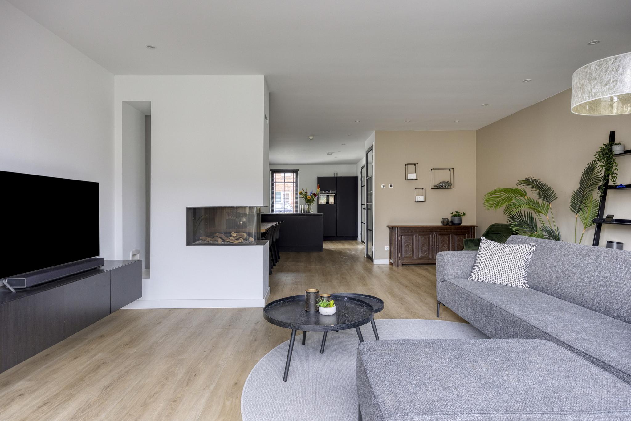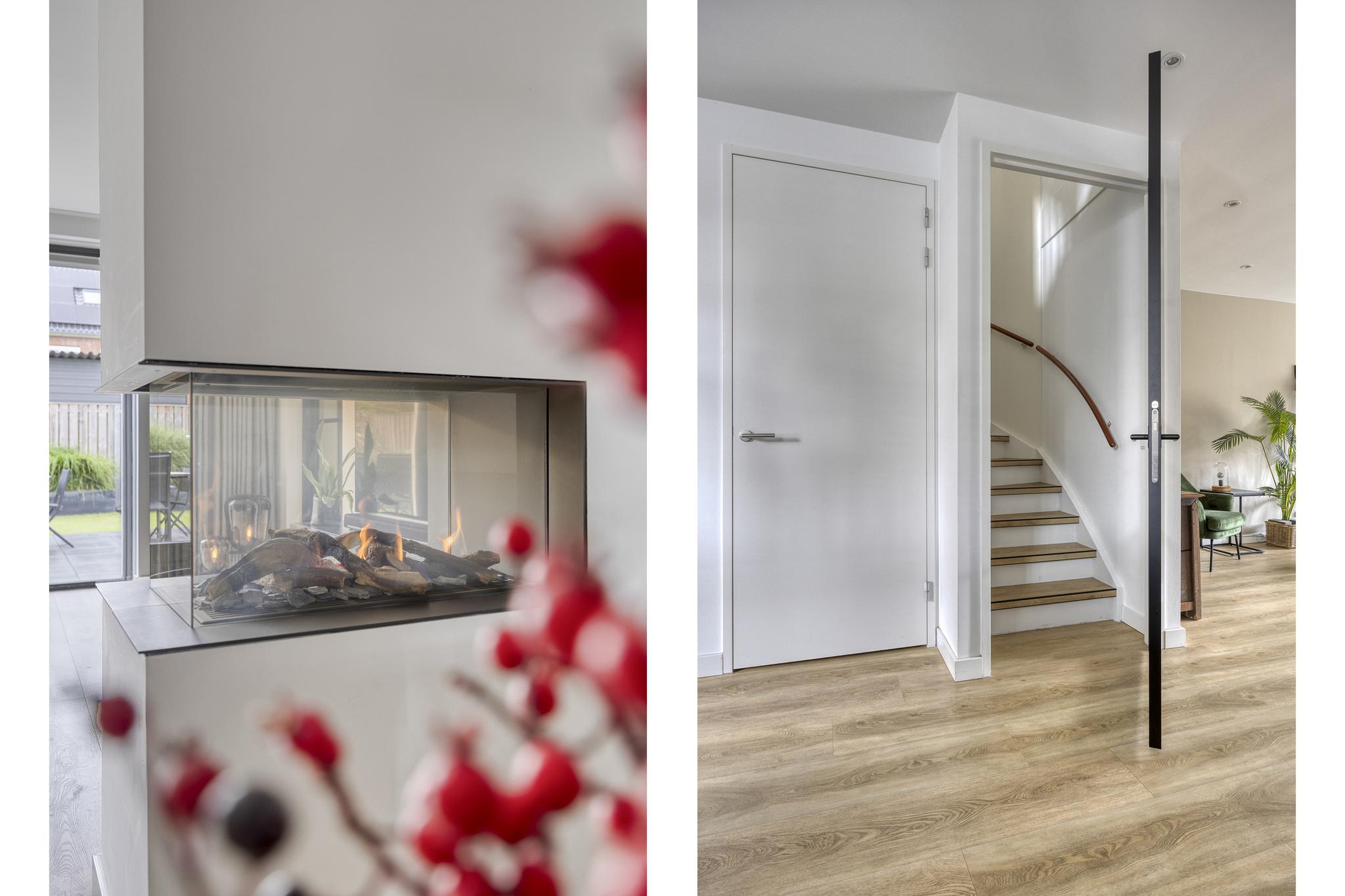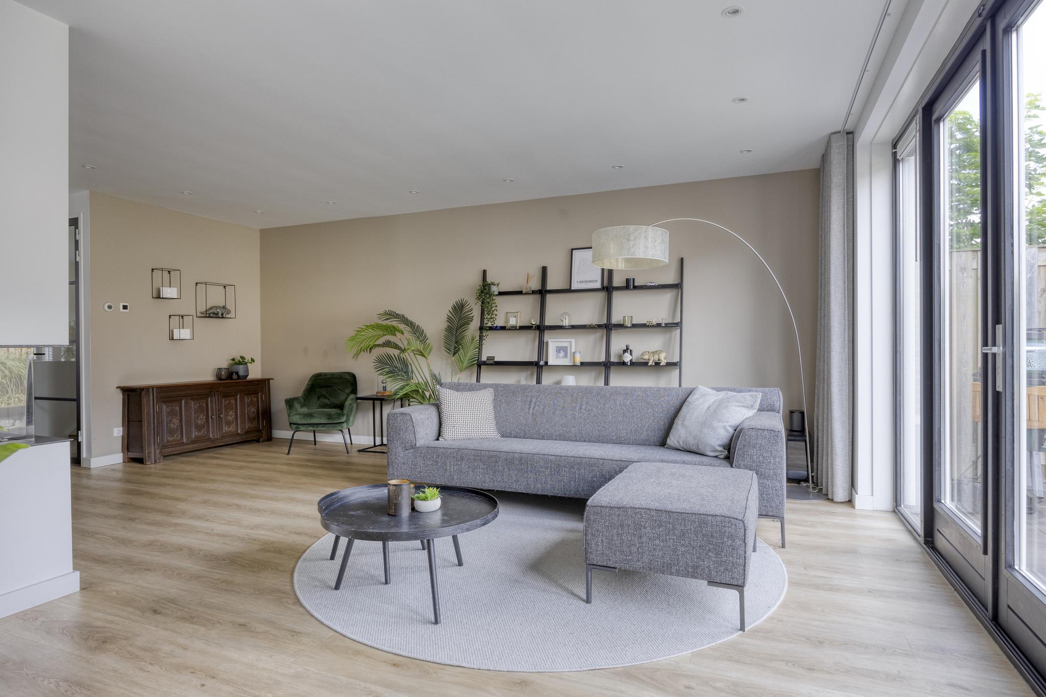 Parkeer je auto op de ruime oprit en betreed de woning via de voordeur. Je komt binnen in de entreehal met toegang tot de meterkast, het toilet en de keuken. Opvallend zijn de luxe houten binnendeuren, die deze verdieping een stijlvolle uitstraling geven. Aan de voorzijde van de woning bevindt zich de moderne open keuken, uitgerust met onder meer een nieuwe vaatwasser uit 2024, een combi-oven, koelkast, vriezer, Quooker en een gaskookplaat. De keuken loopt door de eetkamer vloeiend over in de woonkamer aan de achterzijde van het huis. Hier is voldoende ruimte voor een gezellige zithoek en een ruime eettafel. De gashaard functioneert als roomdivider en zorgt voor extra sfeer, zeker in de wintermaanden. Dankzij de dubbele tuindeuren heb je direct toegang tot de zonnige achtertuin. De woonkamer beschikt ook over een handige trapkast, toegang naar de trap naar de eerste verdieping en naar de multifunctionele ruimte welke weer toegang geeft naar de inpandig te bereiken garage.