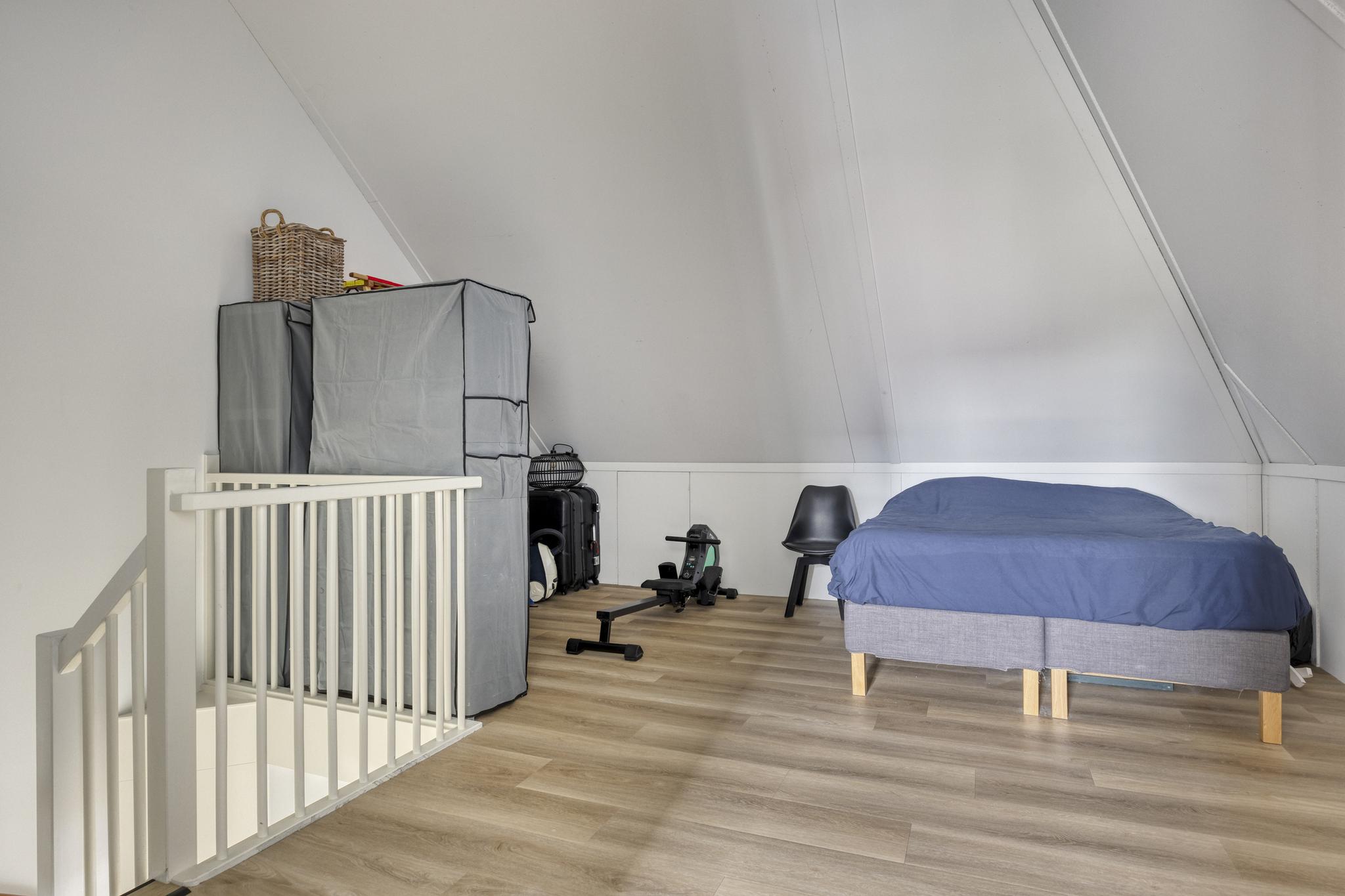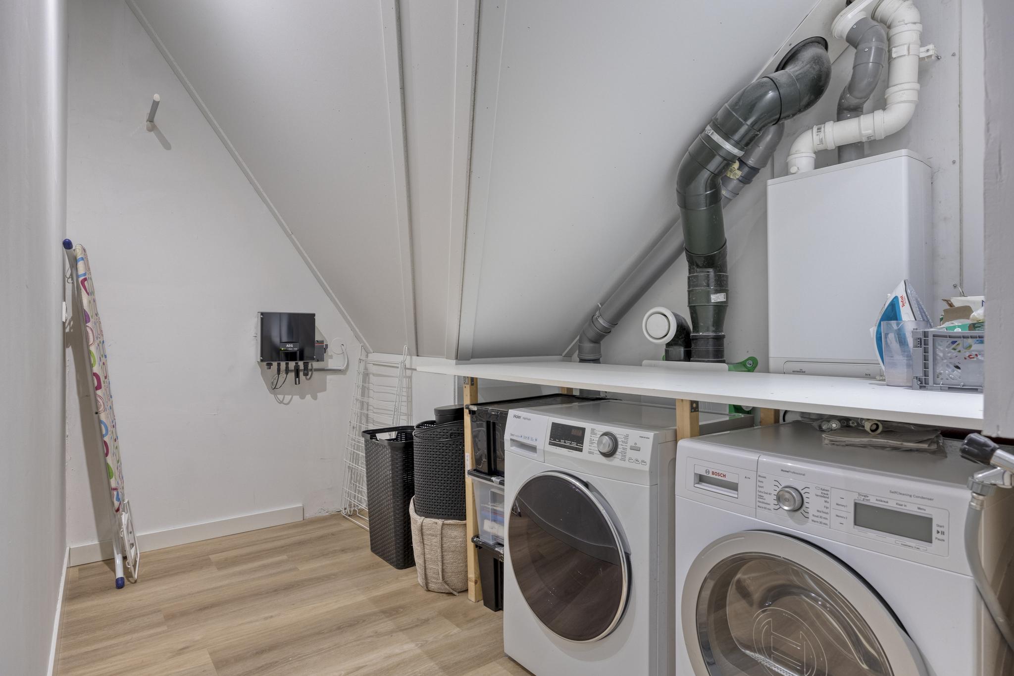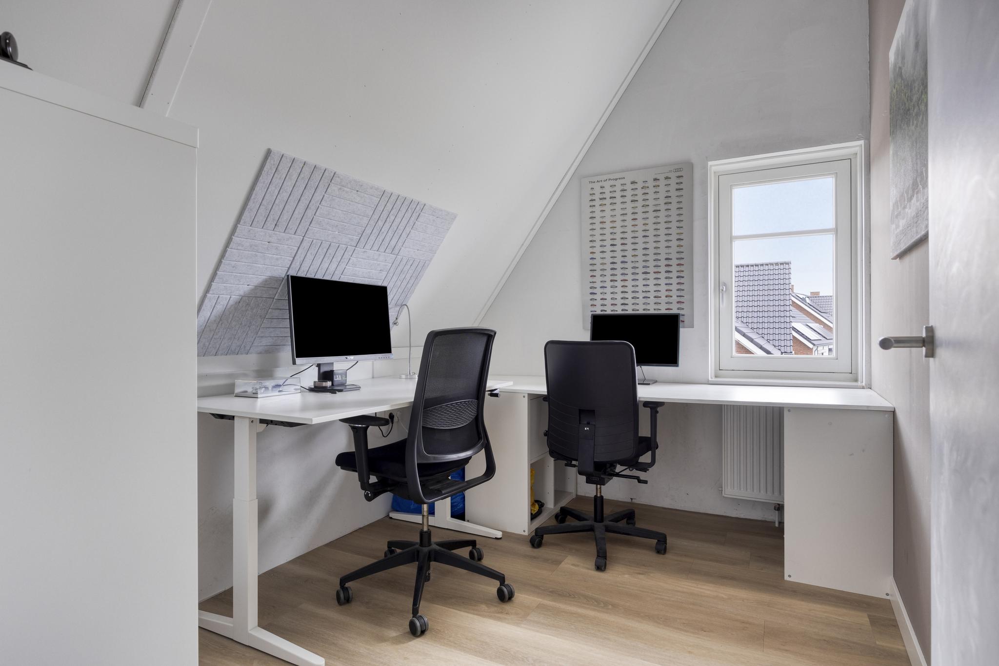 De tweede verdieping bereik je via een vaste trap. Hier kom je terecht in een royale ruimte die dienst kan doen als vierde slaapkamer. Er is voldoende ruimte voor een tweepersoonsbed, een bureau of zelfs een zithoek. In de knieschotten is slimme bergruimte gecreëerd voor spullen die je niet dagelijks gebruikt. Daarnaast zijn er nog twee aparte kamers op deze verdieping aanwezig. Eén daarvan is momenteel ingericht als kantoorruimte, met natuurlijk daglicht via een raamkozijn. De andere kamer doet dienst als technische ruimte. Hier vind je de opstelplaatsen van de cv-ketel, wasmachine en wasdroger. Kortom: een multifunctionele verdieping met volop mogelijkheden.