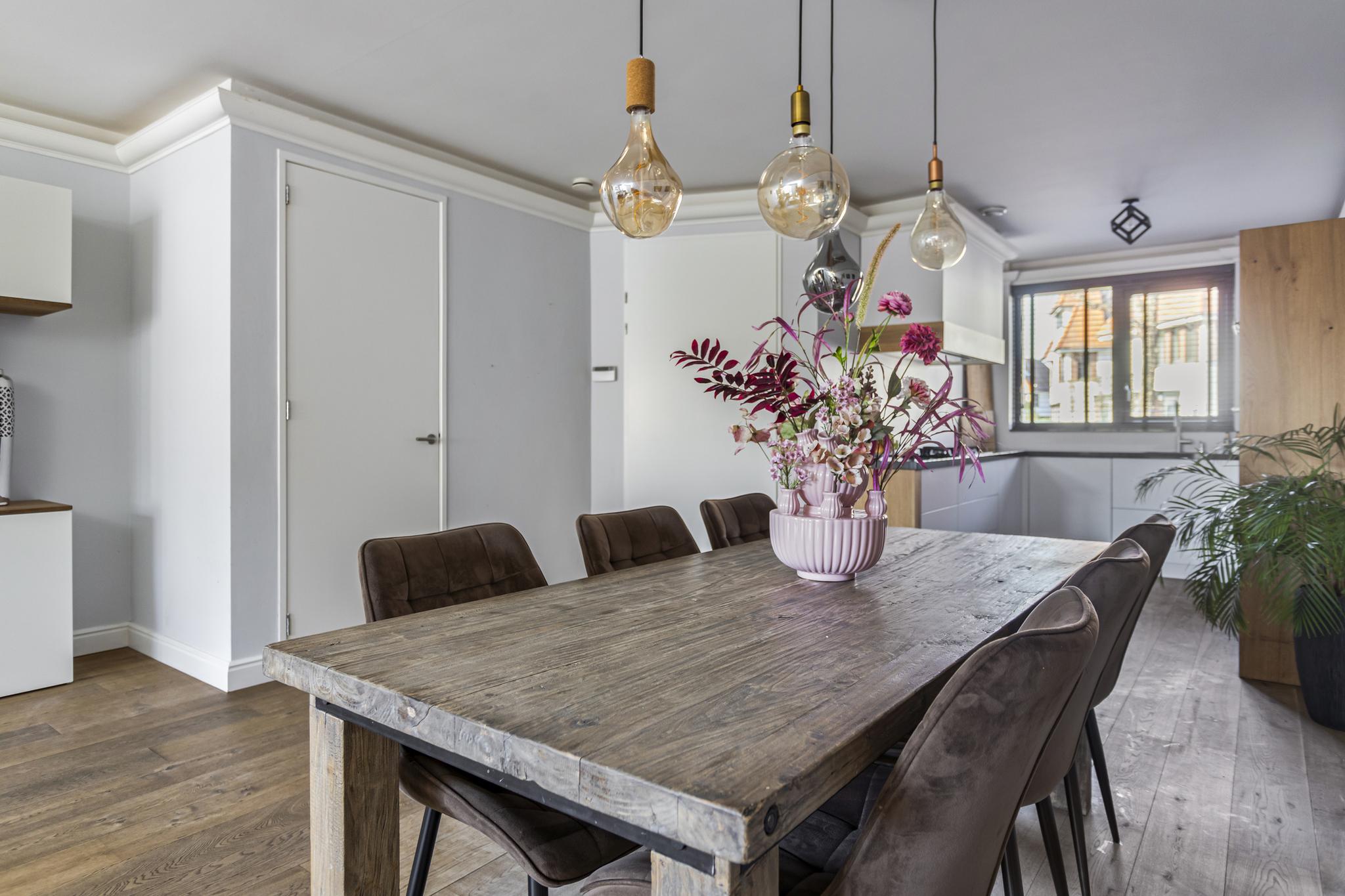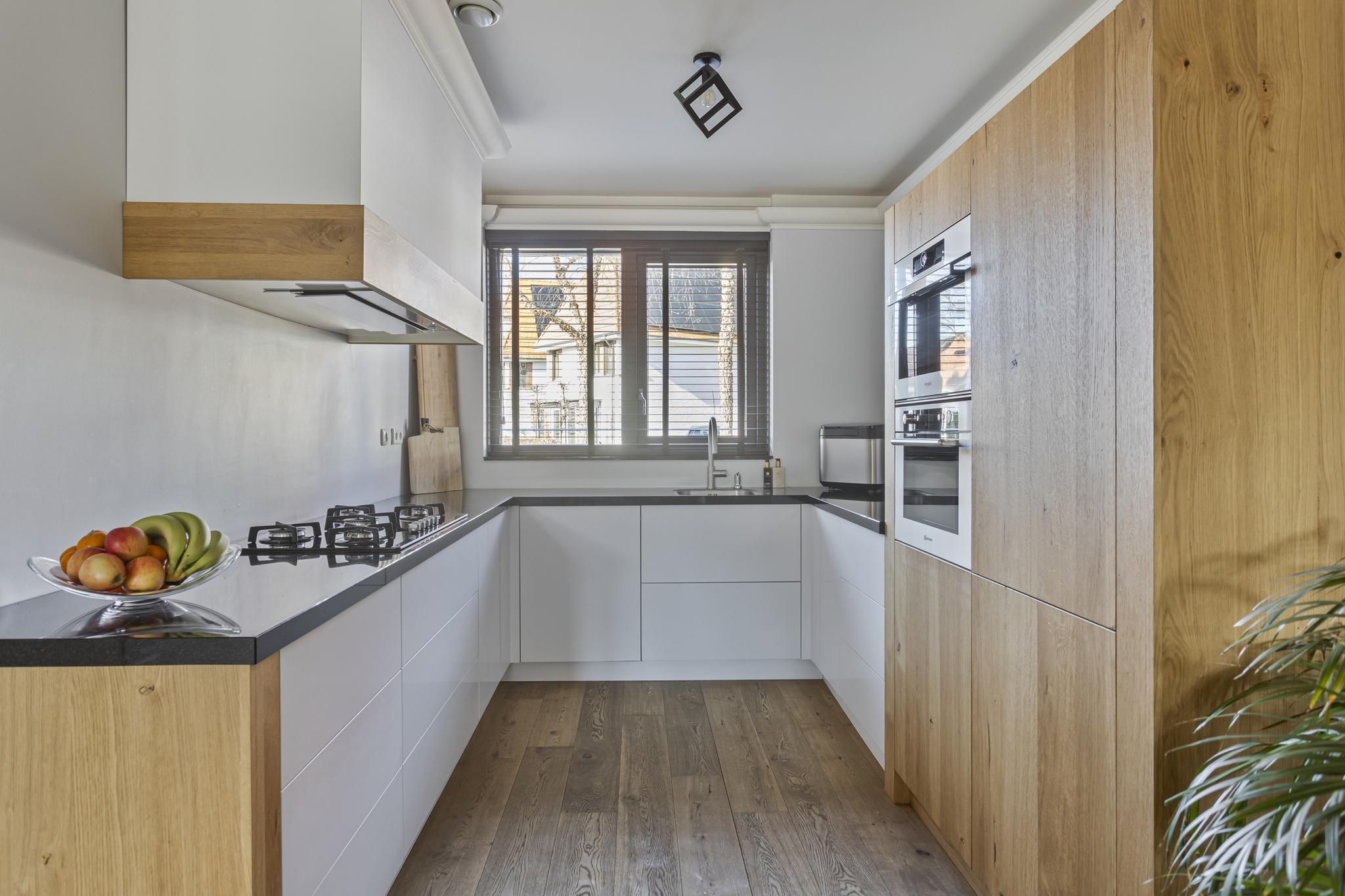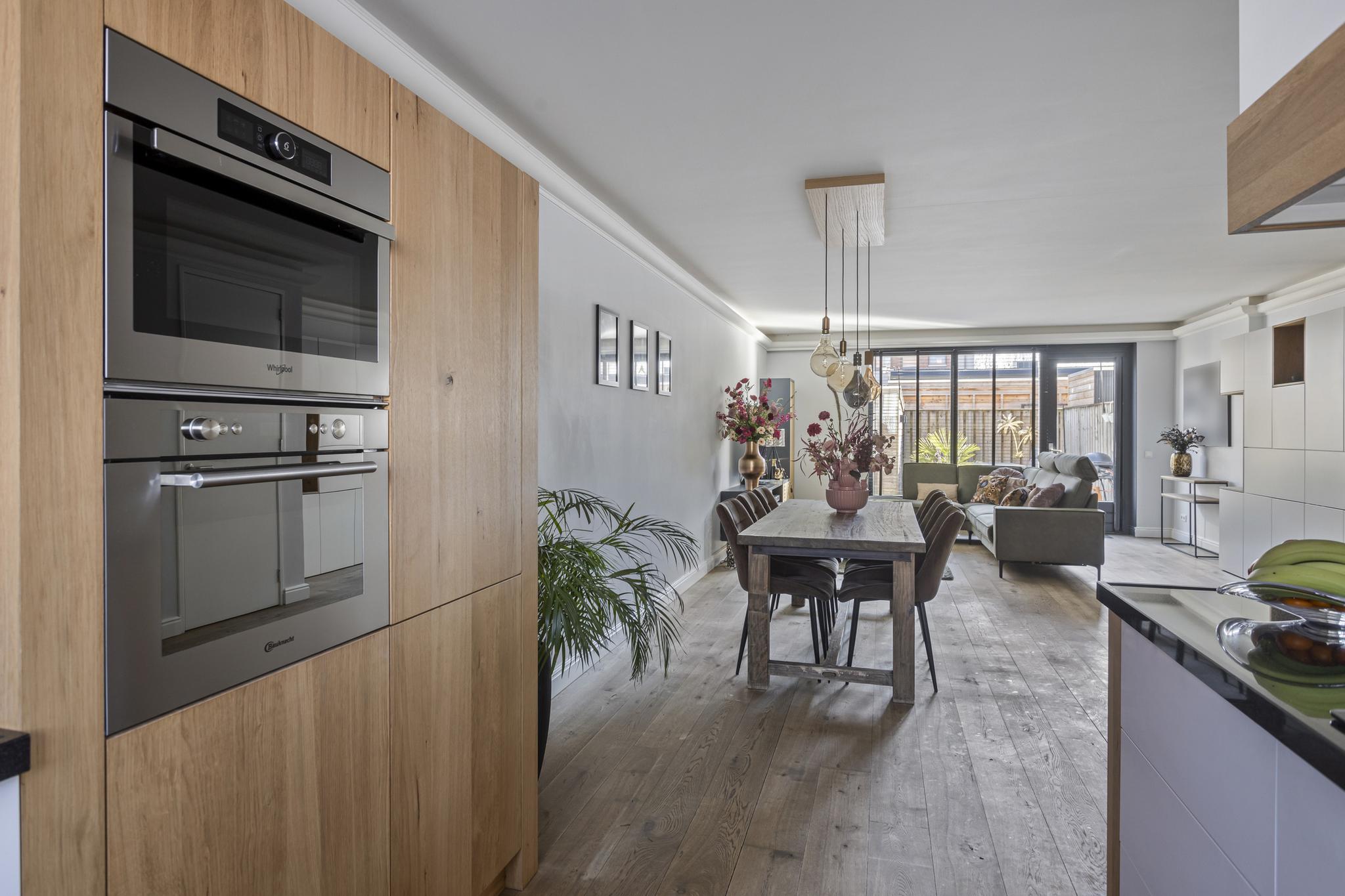 Hal/entree met garderobe, meterkast en toiletruimte met hangend closet. Vanuit de hal is de sfeervolle uitgebouwde woonkamer met open keuken bereikbaar. De luxe keuken is gesitueerd aan de voorzijde van de woning en is voorzien van diverse inbouwapparatuur waaronder een vaatwasser, koel/vriescombinatie (2022), combimagnetron 2x en 5-pits gaskookplaat met afzuigkap. De keuken is zeer luxe met eikenhout, hardstenen werkblad en voorzien van een elektrische ladesysteem. De woonkamer heeft op maat gemaakte kasten en is door de uitbouw en grote raampartij heerlijk licht en goed in te richten door de royale afmetingen. Via de loopdeur is er toegang tot de zonnige op het zuiden gelegen achtertuin met achterom en een houten berging met elektra. De gehele begane grond is voorzien van een houten vloer met vloerverwarming.