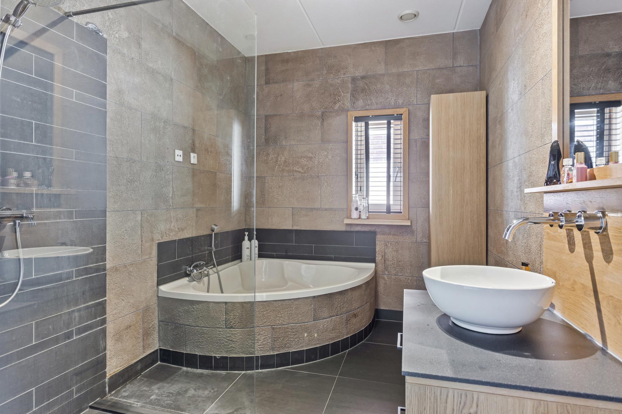 - Ligbad, wastafel, wastafelmeubel en inloopdouche