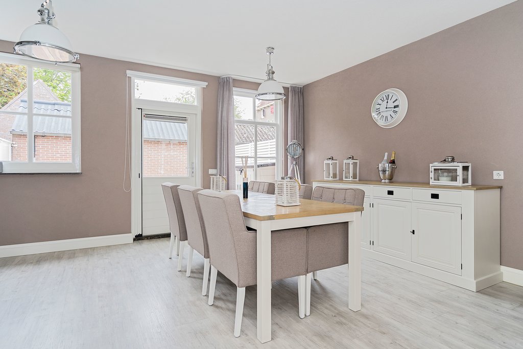 Vanuit de eethoek is de achtertuin met schuur bereikbaar.
