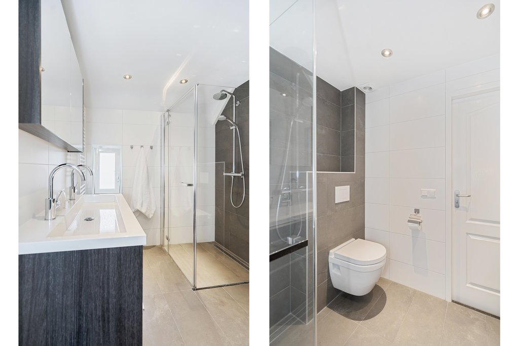 Hier bevinden zich drie slaapkamers en de badkamer (2016), welke is voorzien van moderne tegelvloer, een inloopdouche, een dubbel wastafelmeubel en een zwevend toilet.
