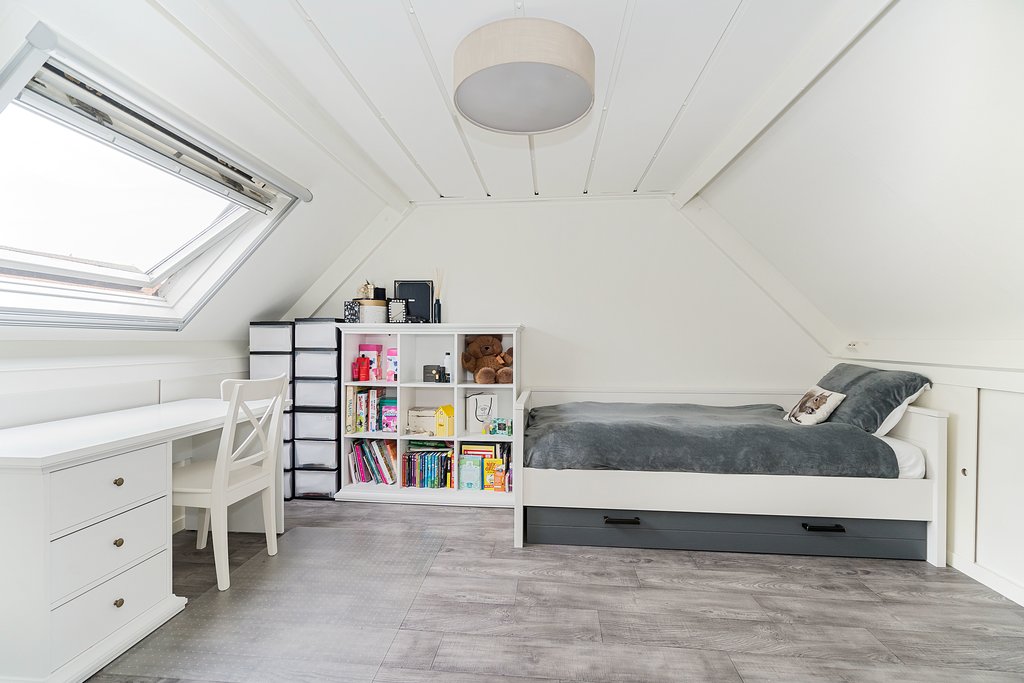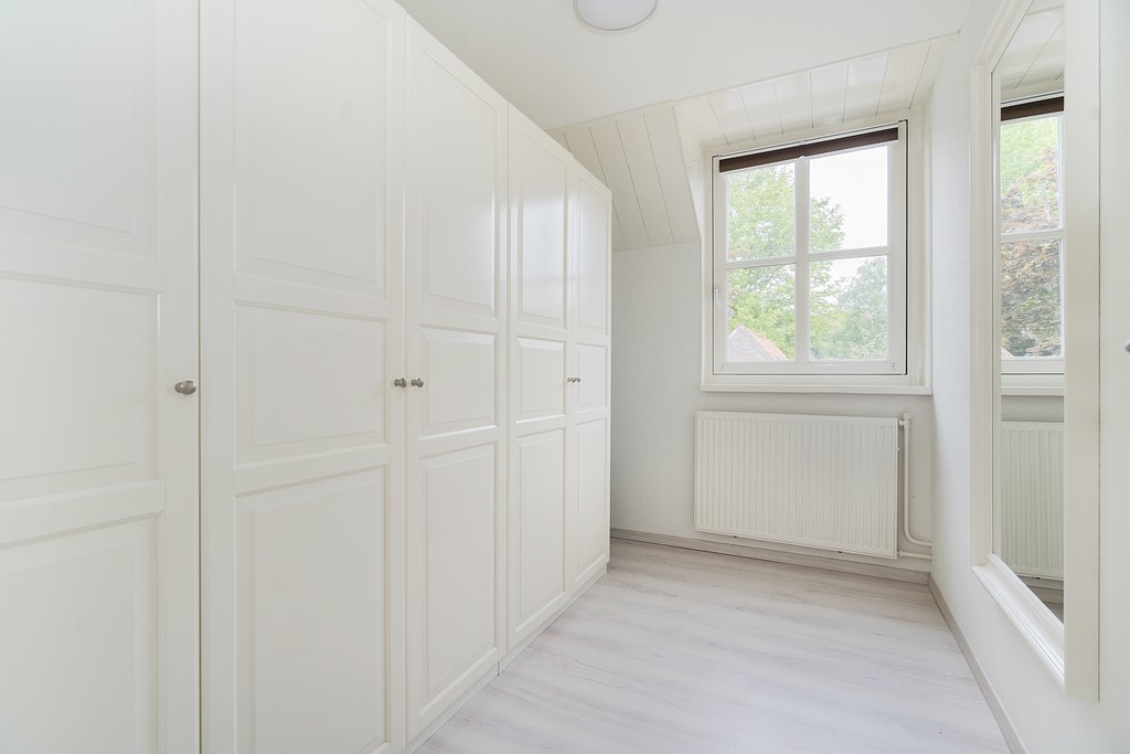 De vierde slaapkamer (18 m²) is verbouwd tot een zeer nette afgewerkte, grote slaapkamer. In de vierde slaapkamer bevindt zich verrassend veel bergruimte achter de knieschotten en op de vliering in de nok.