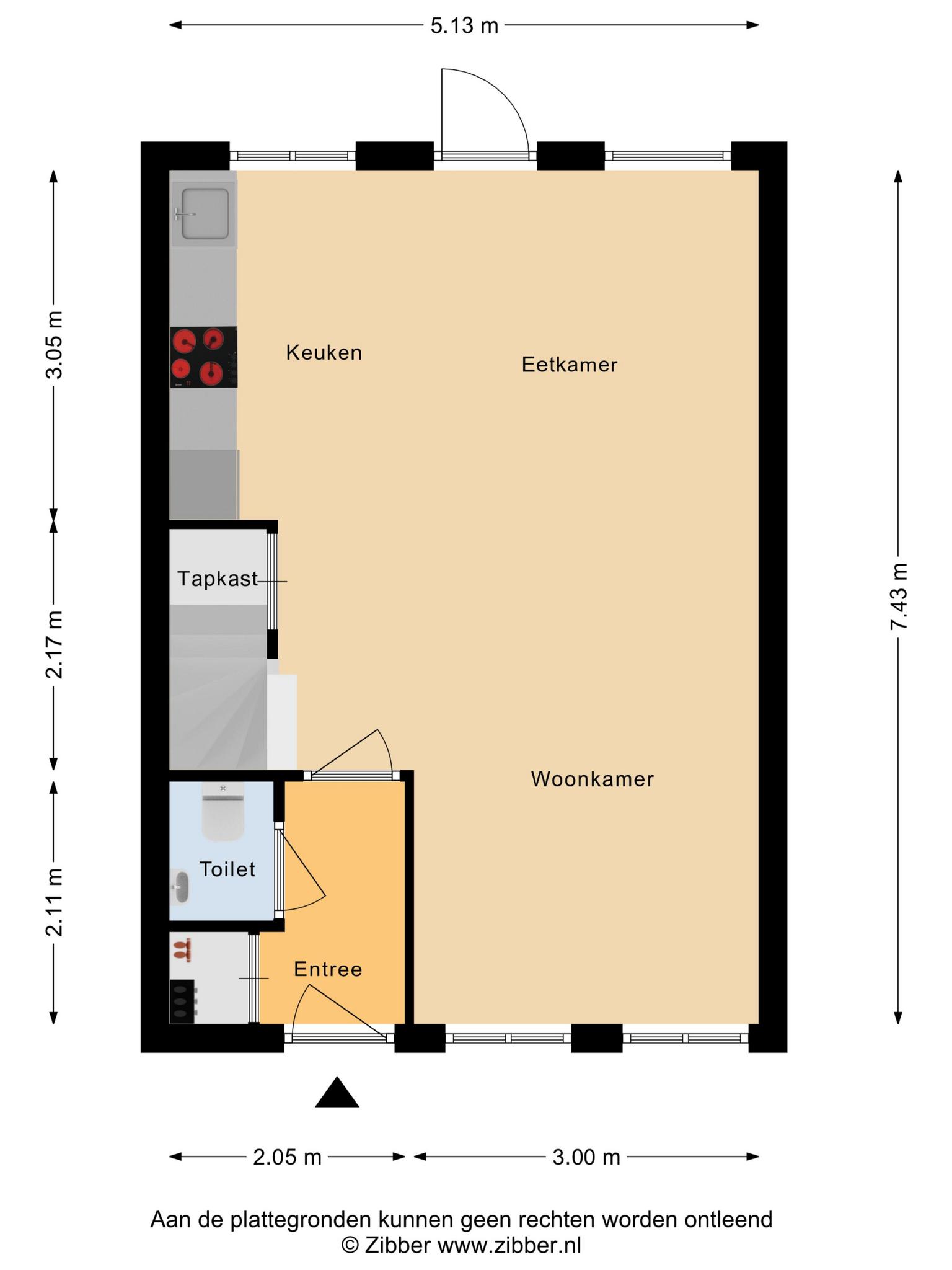 Op de begane grond bevindt zich de entree, het toilet, de woonkamer met ruime eet- en zithoek en de trapopgang naar de eerste verdieping.